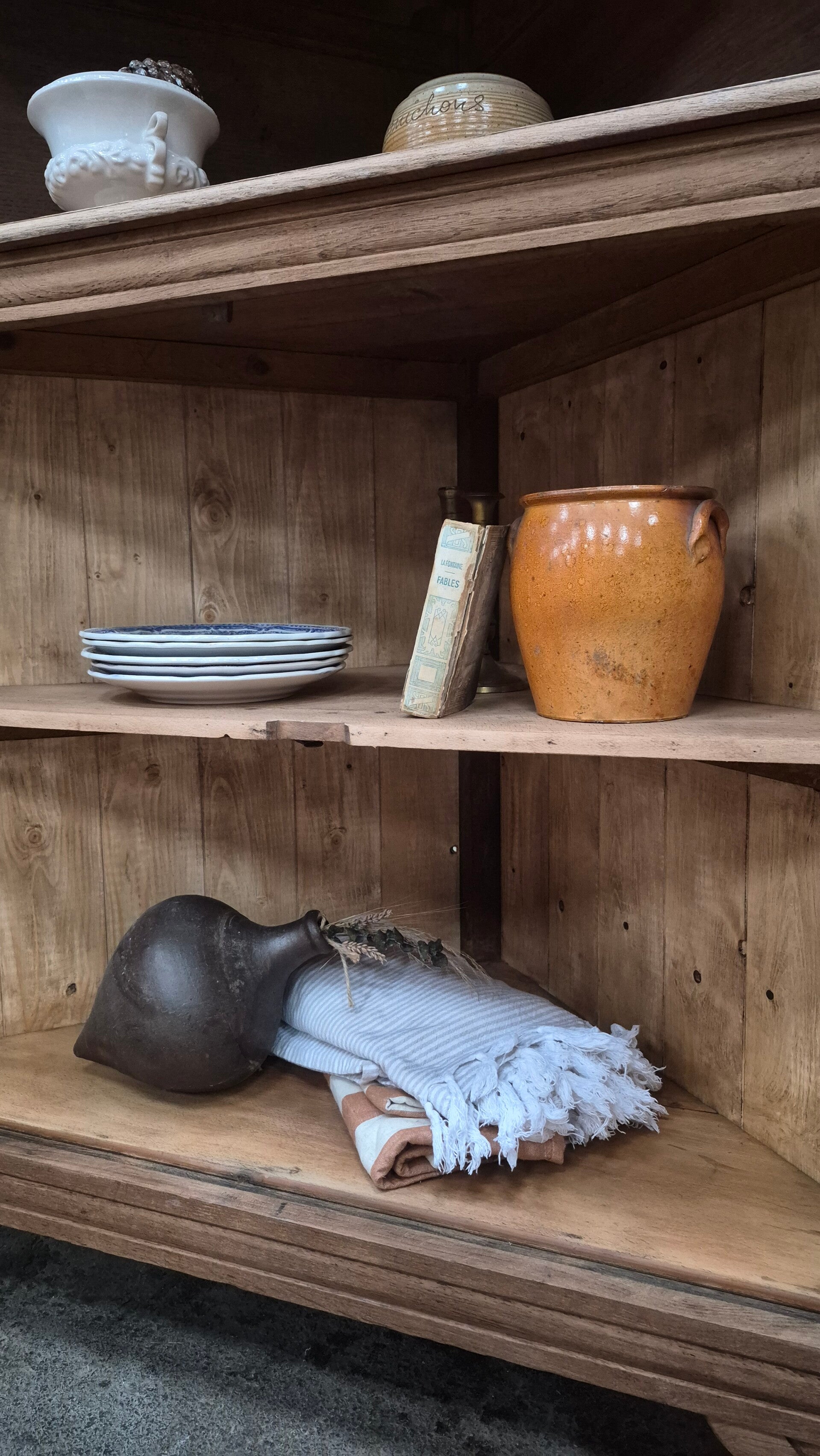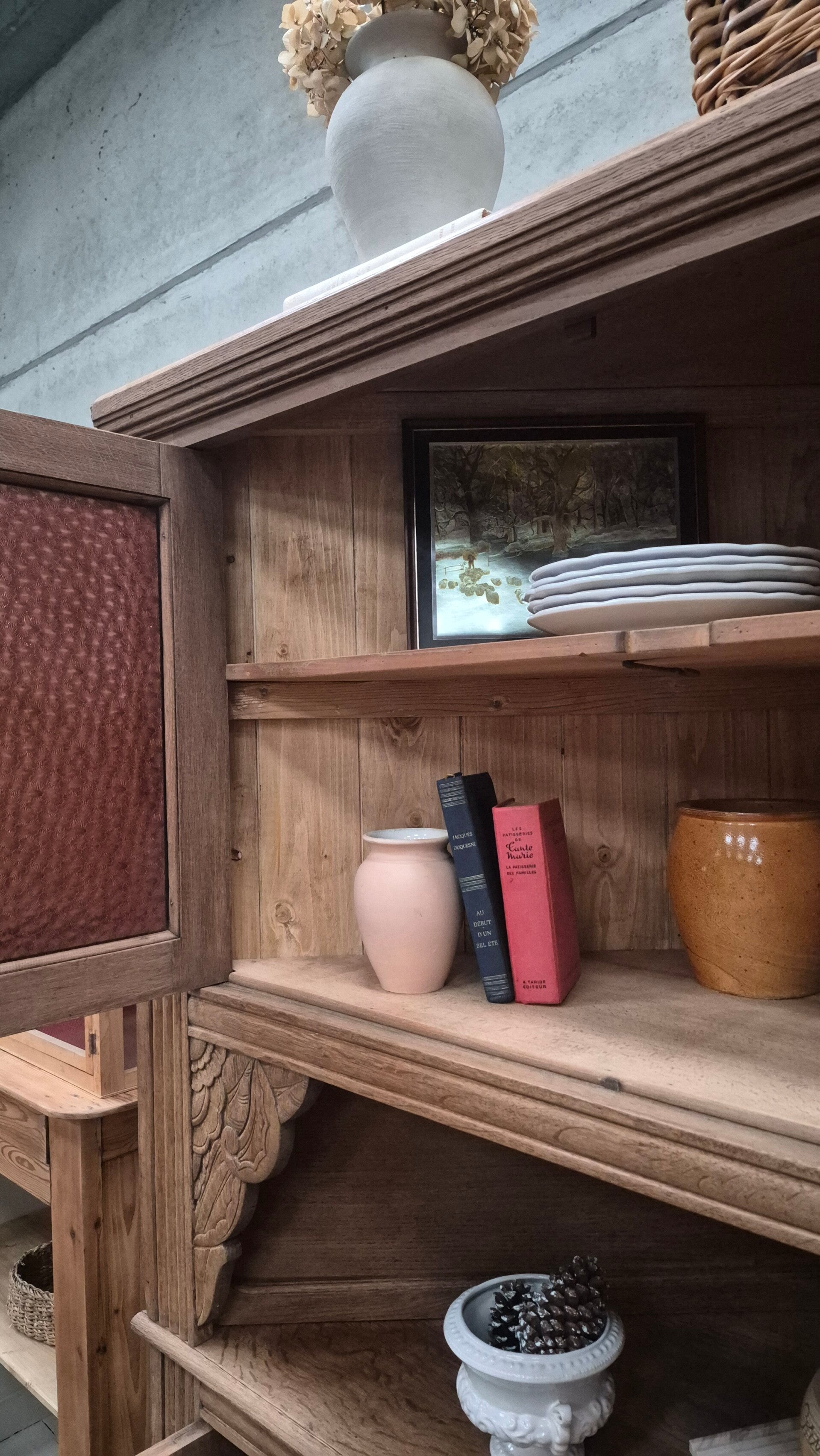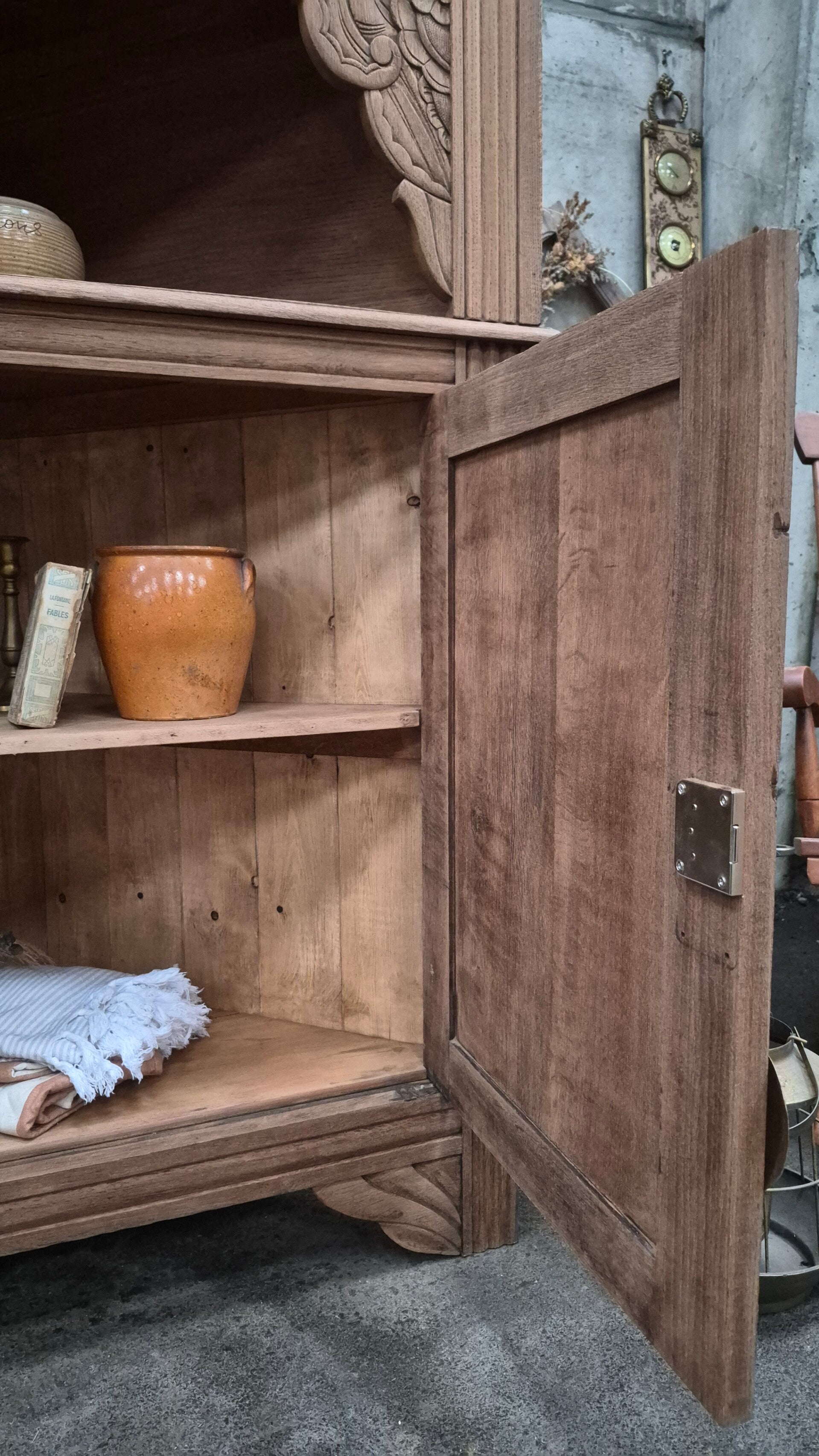 Très beau buffet double d'angle de style Art Déco, entièrement rénové avec soin dans le respect de son caractère d’origine. Chêne massif poncé, traité et ciré incolore, finition naturelle mettant en valeur le veinage et les sculptures. Vitrage d’origine conservé : superbe verre Florentine ancien, teinté pourpre / bordeaux.