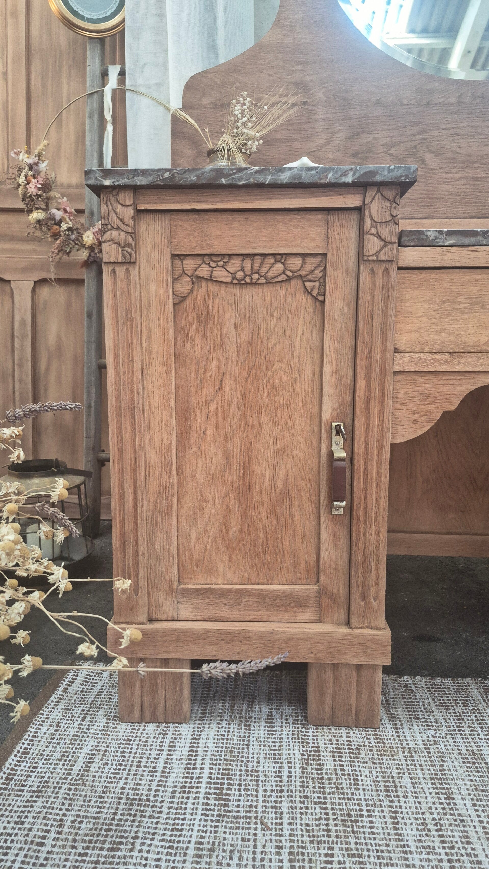 Un souffle des années 30, entre douceur minérale et lignes sculptées. Coiffeuse Art déco, entièrement d’origine : marbres en très bel état, miroir biseauté, quincailleries et clefs d’époque. Une pièce authentique, en chêne massif, prête à écrire une nouvelle histoire.